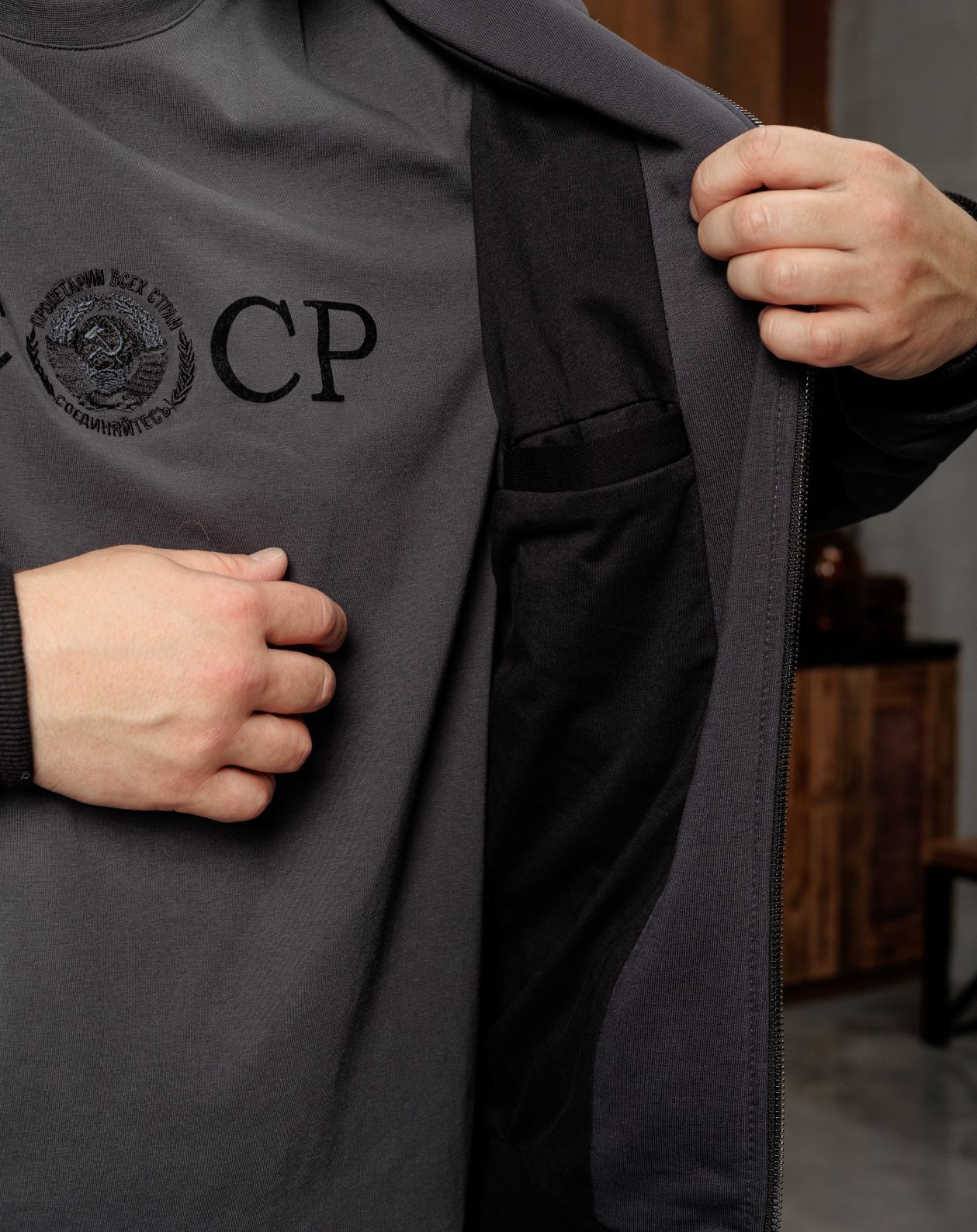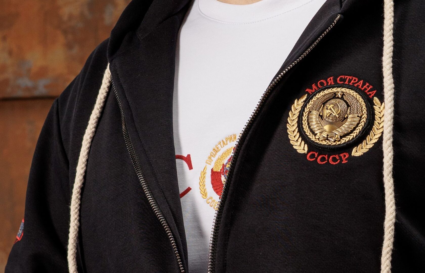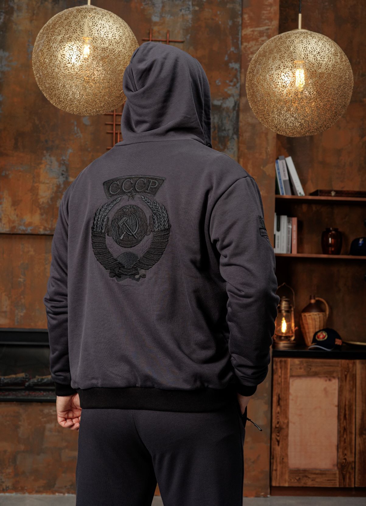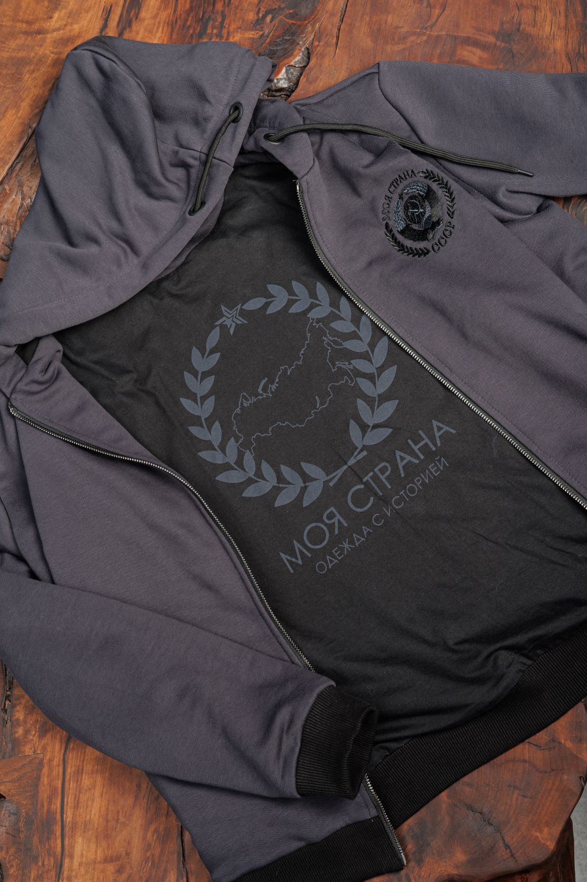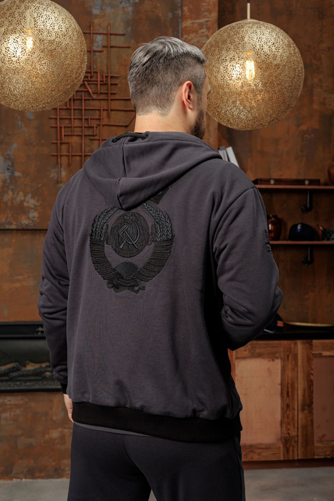 Толстовка с подкладкой на молнии с капюшоном. Спереди вышит герб СССР. На правом рукаве вышивка "СССР сверхдержава". На спине вышит большой герб СССР. Подкладка черного цвета. На подкладке принт "Моя страна". Карманы на молниях. Листочки на карманах черного цвета. Внутренний карман без молнии. Главная молния металлическая. Пояс черного цвета. Цвет: темно-серый. Состав: 65% хлопок, 35% полиэстер. Подкладка: 100% хлопок. Сделано в России.