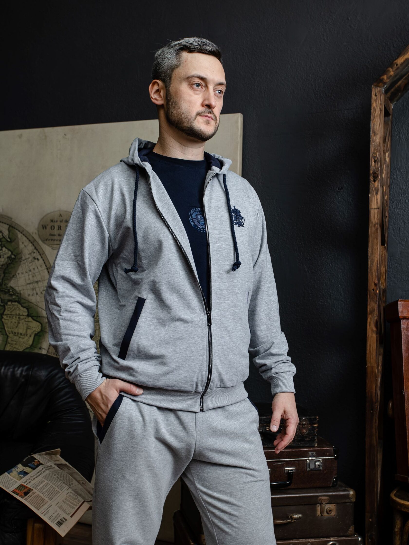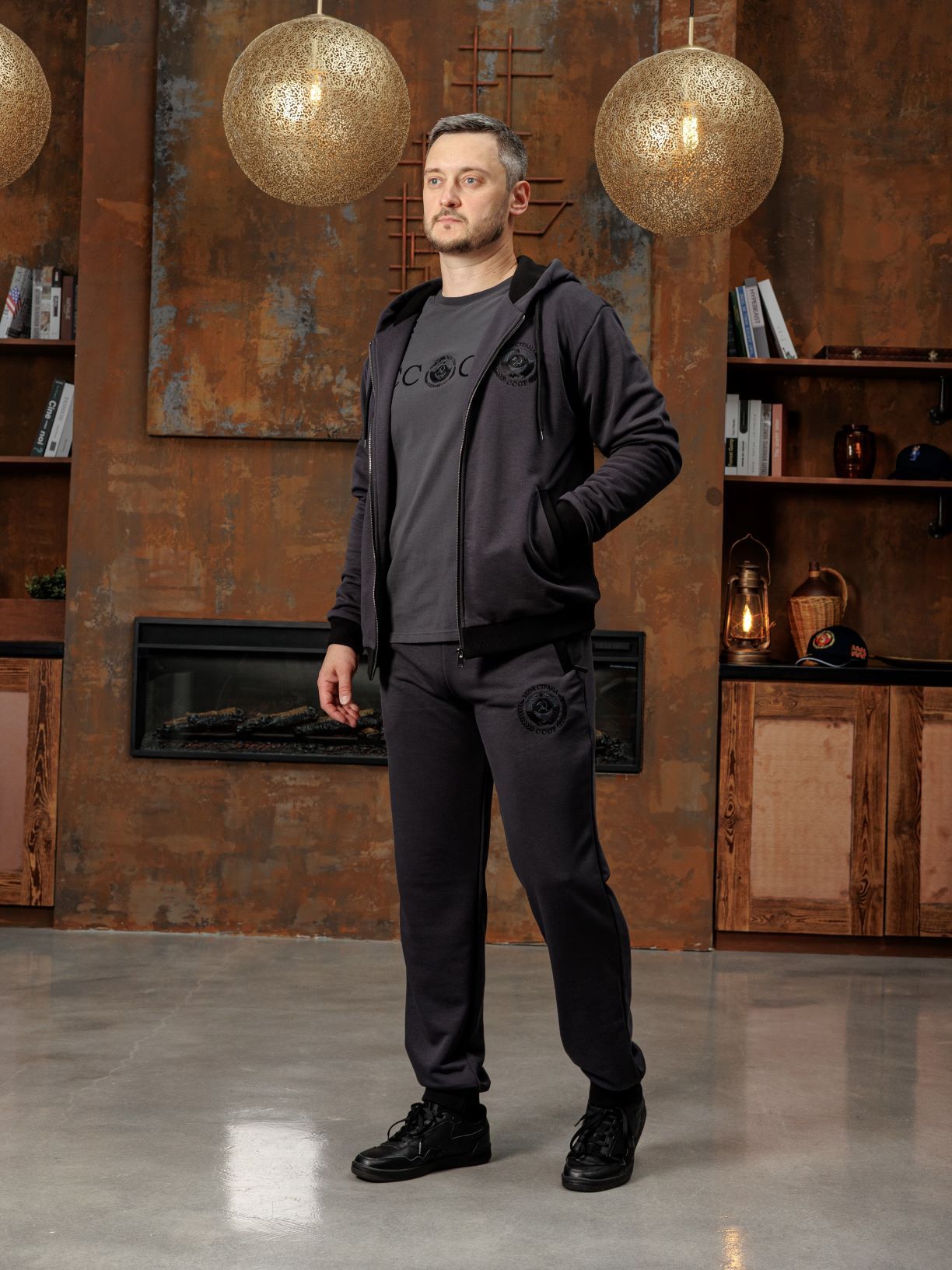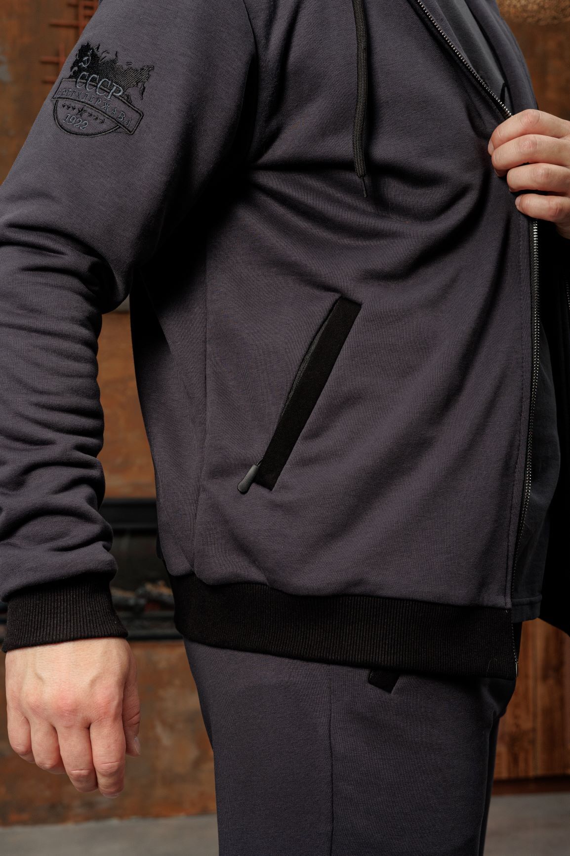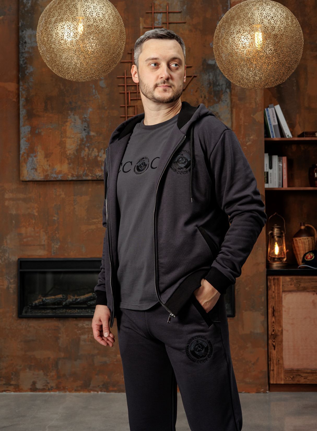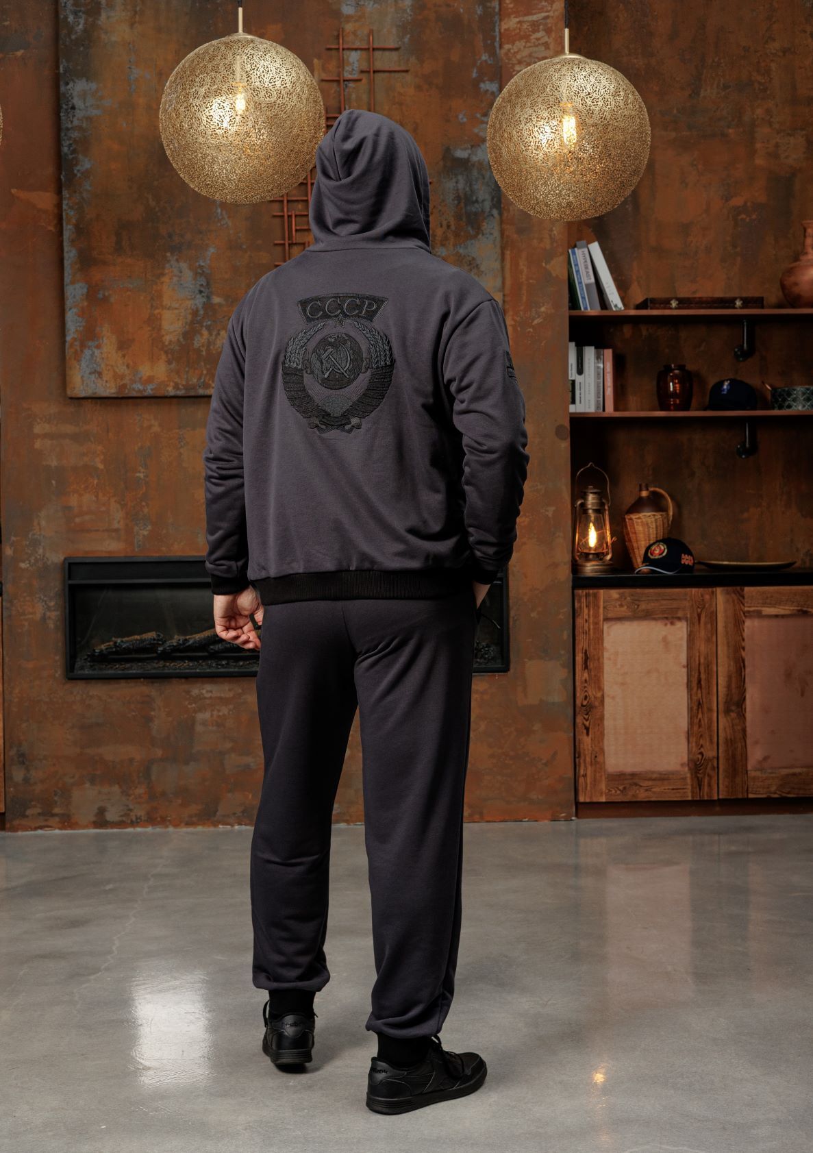 Толстовка с подкладкой на молнии с капюшоном. Спереди вышит герб СССР. На правом рукаве вышивка "СССР сверхдержава". На спине вышит большой герб СССР. Подкладка черного цвета. На подкладке принт "Моя страна". Карманы на молниях. Листочки на карманах черного цвета. Внутренний карман без молнии. Главная молния металлическая. Пояс черного цвета. Цвет: темно-серый. Состав: 65% хлопок, 35% полиэстер. Подкладка: 100% хлопок. Сделано в России.