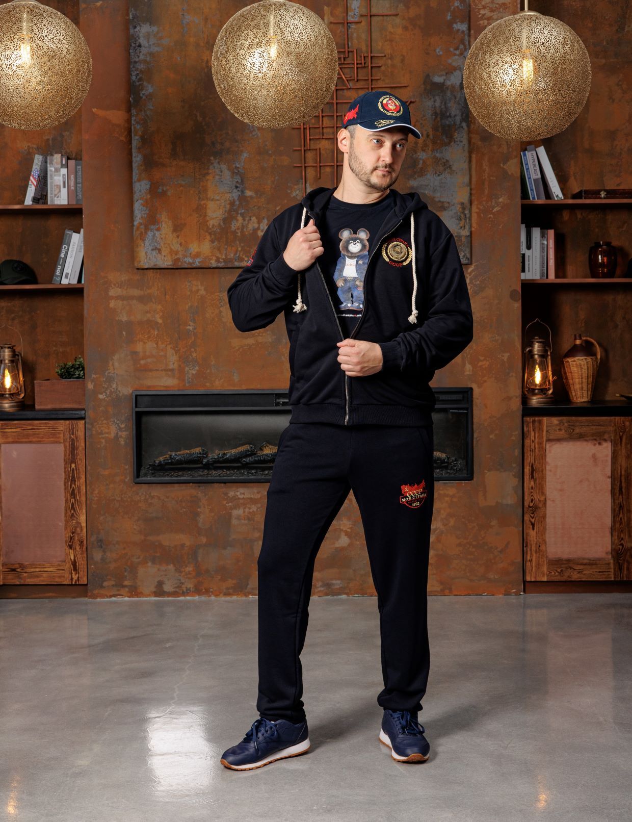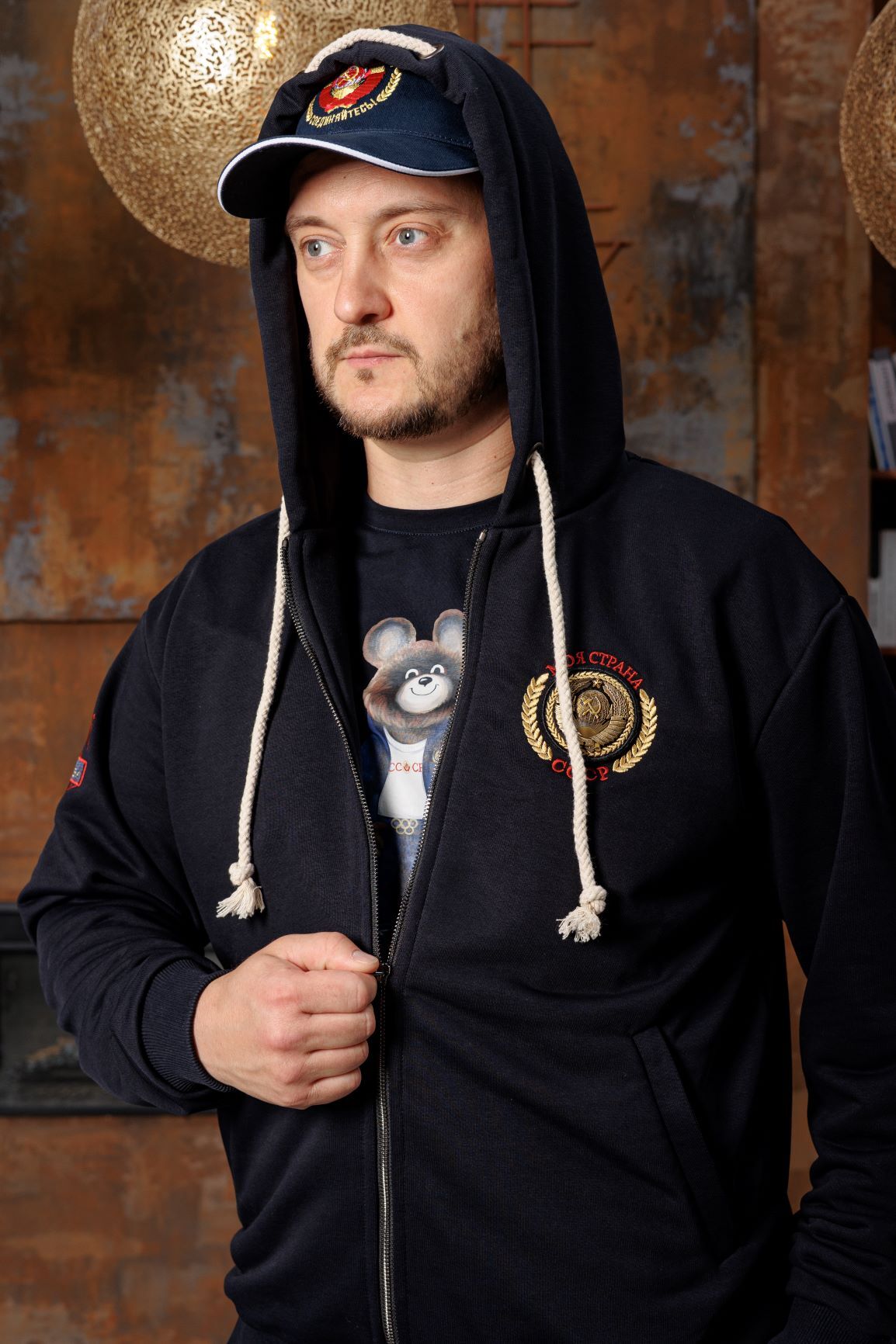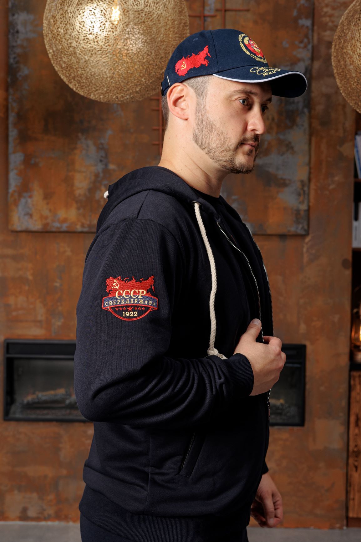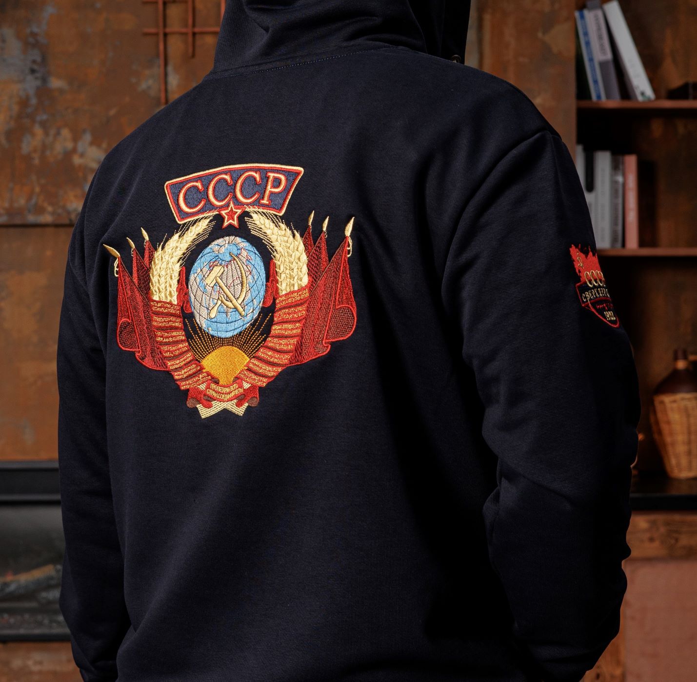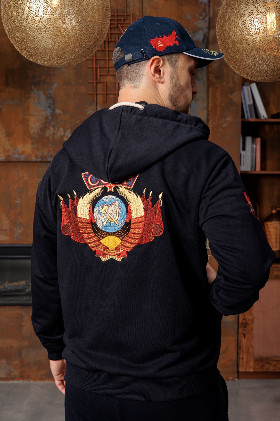 Толстовка на молнии с капюшоном. Спереди съемный шеврон на липучке с металлическим гербом СССР. На спине вышит герб СССР со знаменами. На правом рукаве вышивка "СССР сверхдержава". Карманы на молниях. Главная молния металлическая. Цвет: темно-синий. Состав: 65% хлопок, 35% полиэстер. Сделано в России.
