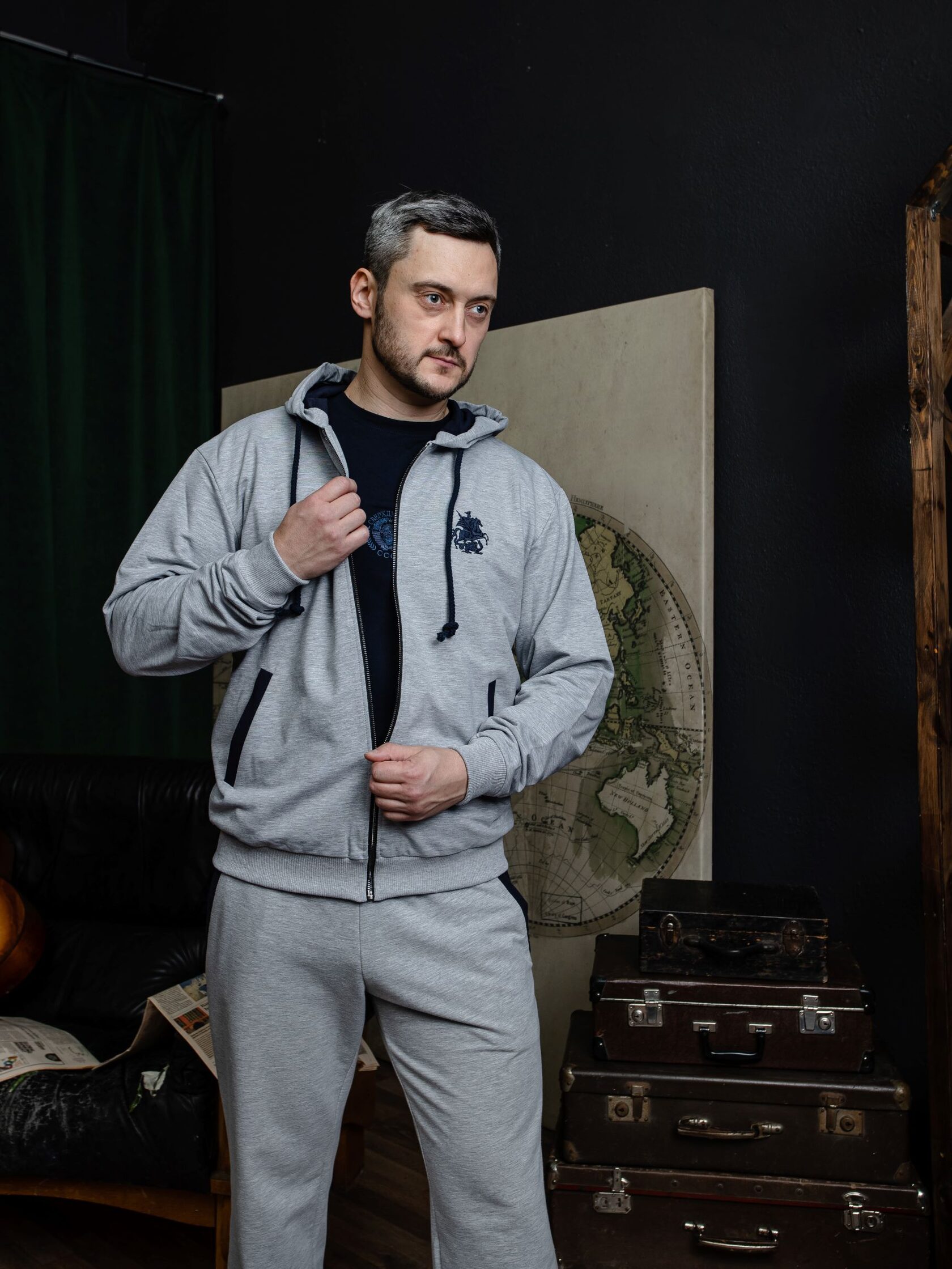 Толстовка на молнии, с подкладкой, с капюшоном. Спереди вышит Георгий Победоносец. Все вставки (внутренняя часть капюшона, карманы, шнурки) и вышивка на толстовке темно-синего цвета. Цвет: серый меланж с темно-синими вставками. Состав: 95% хлопок, 5% лайкра. Сделано в России.